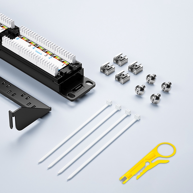 - Easy Installation and Maintenance: The 24-port patch panel features a user-friendly design for effortless installation. It often has a standard 19-inch rack-mountable form factor, allowing for convenient integration into server racks or network cabinets. The cable termination process is straightforward, with clear markings and color-coded guides to assist in correct cable connection. Maintenance is also simplified, as each port is easily accessible for testing and troubleshooting, reducing the time and effort required for network management.